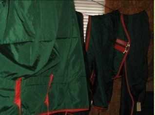 Blankets come in all styles and sizes, for use in the stable or for turnout. However, they all have one thing in common: fill. The fiberfill or polar fleece used requires special care during laundering and extra time to dry thorougly. There is an additional charge for laundering matching hoods and neckpieces.